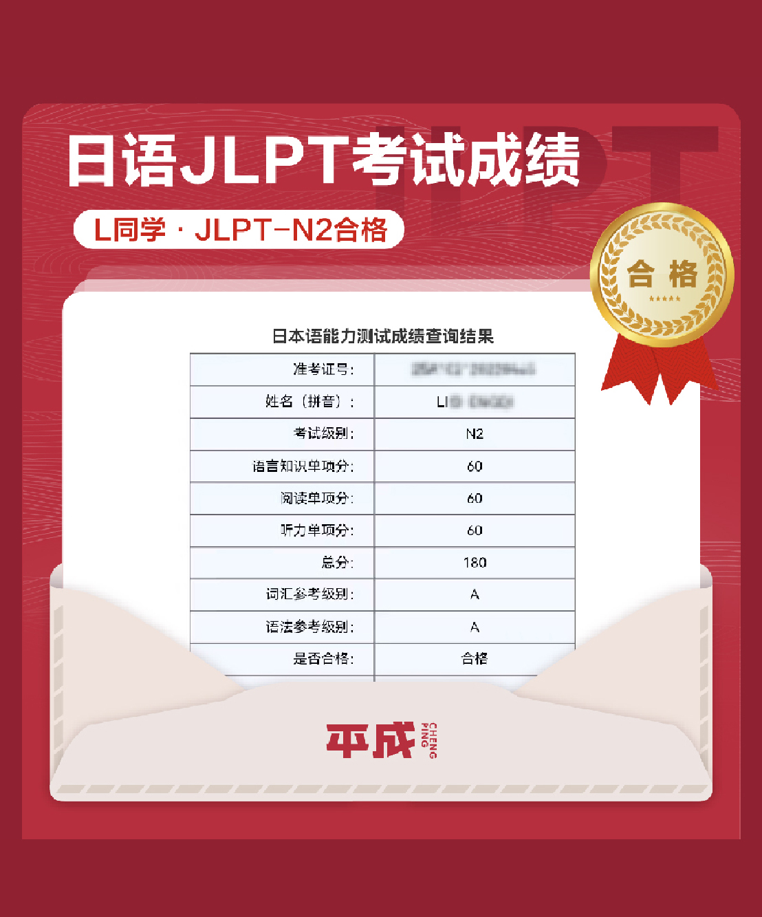 L同學(xué)在2025年8月的JLPT考試中獲取180分